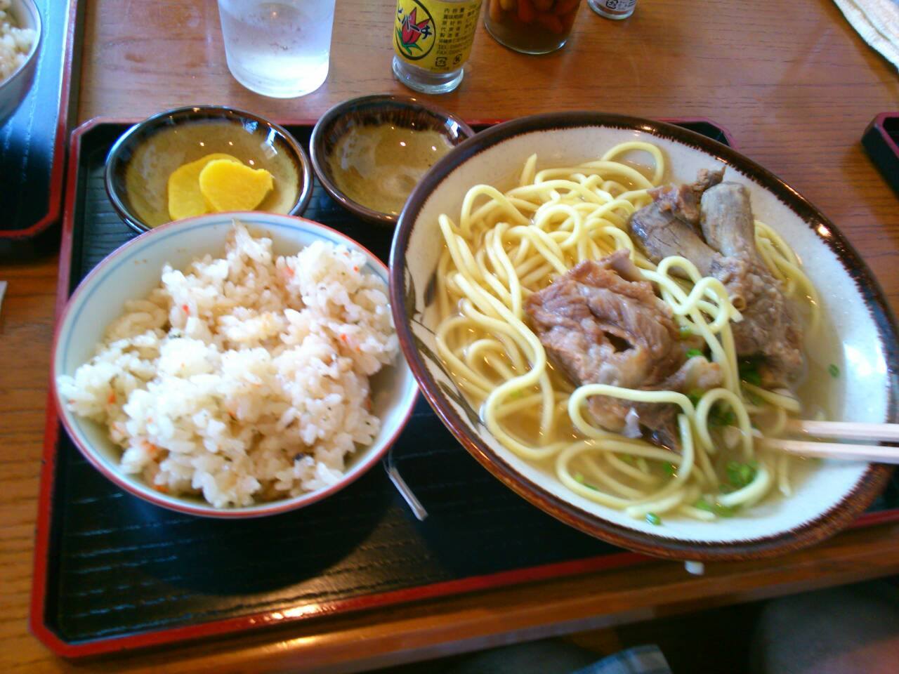 2日目のお昼。ちょっと食べちゃったけどジューシーと呼ばれる炊き込みご飯と八重山そばソーキ乗せです! ウマいです(*^^*)